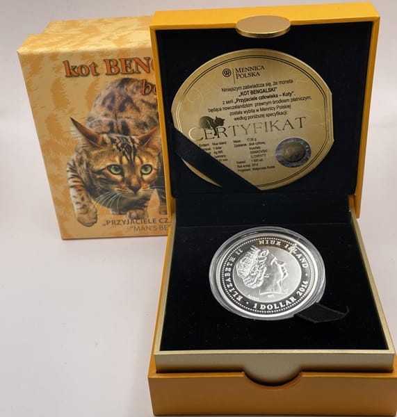 1 dolar Kot bengalski 2014 r. - srebrna moneta kolekcjonerska, producent Mennica Polska S.A. na zlecenie Centralnego Banku Nowej Zelandii, stempel lustrzany, moneta w kapslu ochronnym, pudełku szkatułkowym i certyfikatem oraz dodatkowym ozdobnym pudełku kartonowym. Zdobiona drukiem cyfrowym, w oczach kota kryształki Swarovski Elements, stan zachowania menniczy