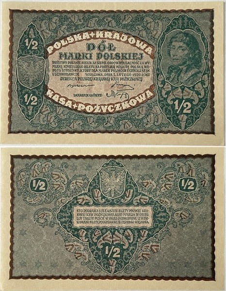1/2 marki 1919 r - banknot obiegowy 1 marka polska 1919 r Polska Krajowa Kasa Pożyczkowa, stan 1/-1 z okresu międzywojennego kategoria Banknoty 1916-1949.
