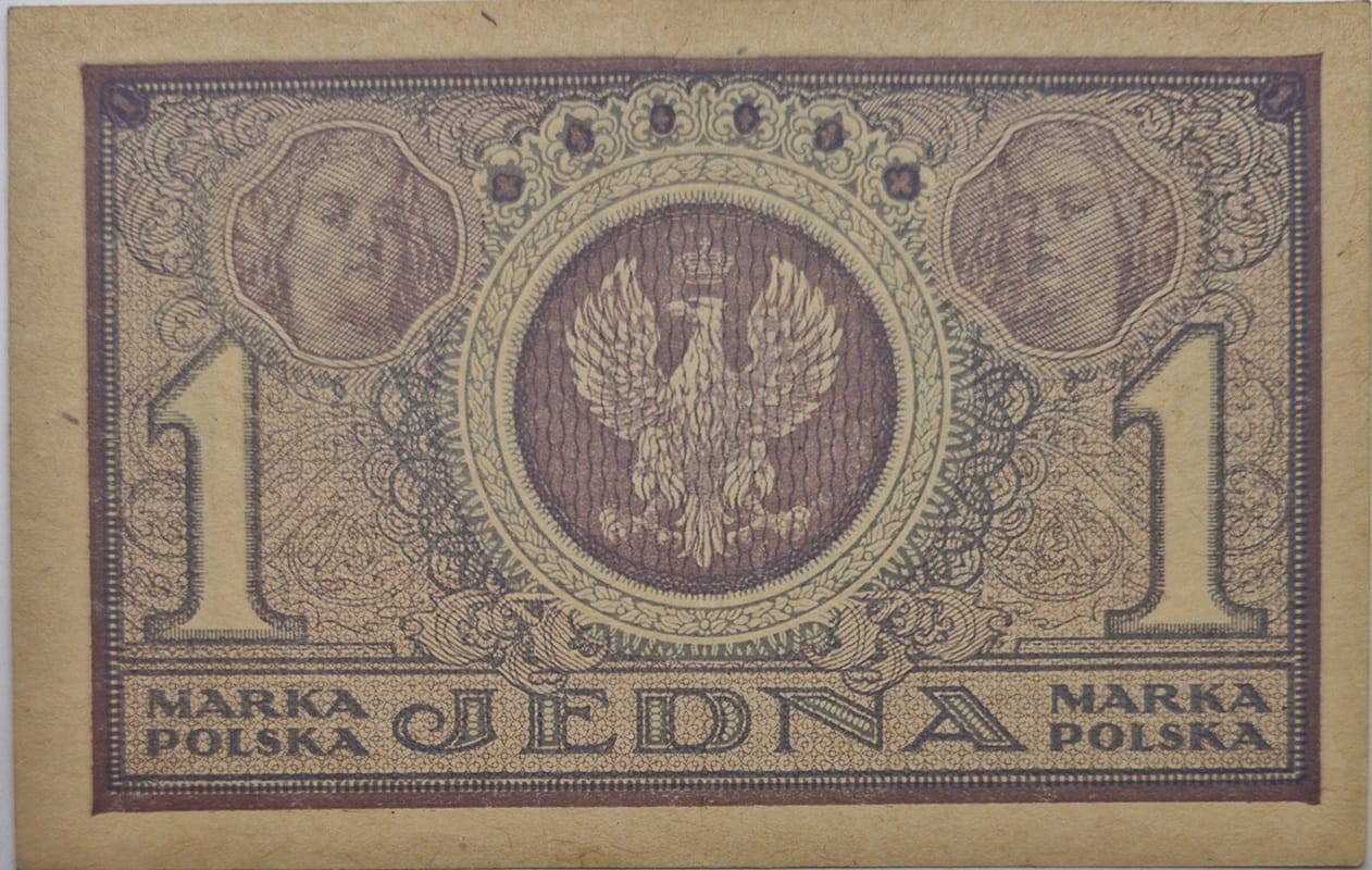 Na awersie w jego centrum orzeł biały w koronie wpisany w okrąg otoczony ornamentami. Po prawej i po lewej stronie przy marginesie nominał banknotu duże białe 1. Nad nimi głowy w ornamentach. Pod nominałem napisy w dwóch rzędach dużymi literami: Marka Polska, a po między słownie napis: Jedna