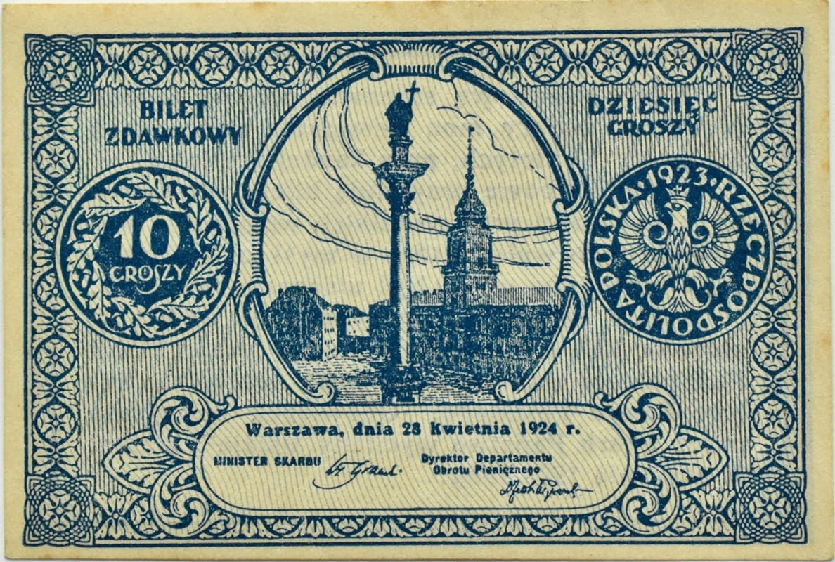 Na awersie biletu zdawkowego po prawej stronie grafika awersu monety 10 groszy z 1923 roku, a po lewej strony grafika rewersu tej monety. Na środku banknotu w owalu kolumna Zygmunta oraz widok na fragment budowli Zamku Królewskiego w Warszawie. Poniżej m.in napisy Warszawa, dnia 28 kwietnia 1924 r.