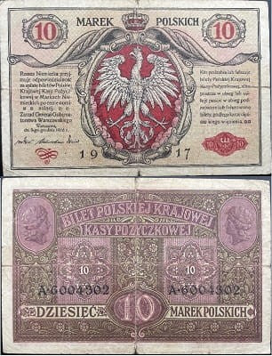 10 marek polskich 1917 generał - banknot obiegowy emitowany przez Polską Krajową Kasę Pożyczkową w Królestwie Polskim.