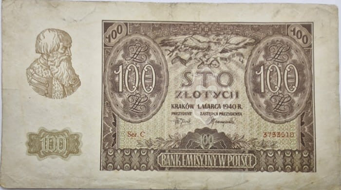 Banknot obiegowy 100 złotych 1940 r. z okresu okupacji niemieckiej, emitent Bank emisyjny w Polsce, materiał papier, rozmiar banknotu 190 mm x 106 mm, stan zachowania ok. 3 , zdjęcie przykładowe