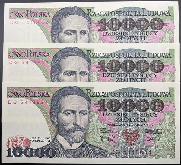 Banknot 10000 zł 1988 Stanisław Wyspiański 3 kolejne