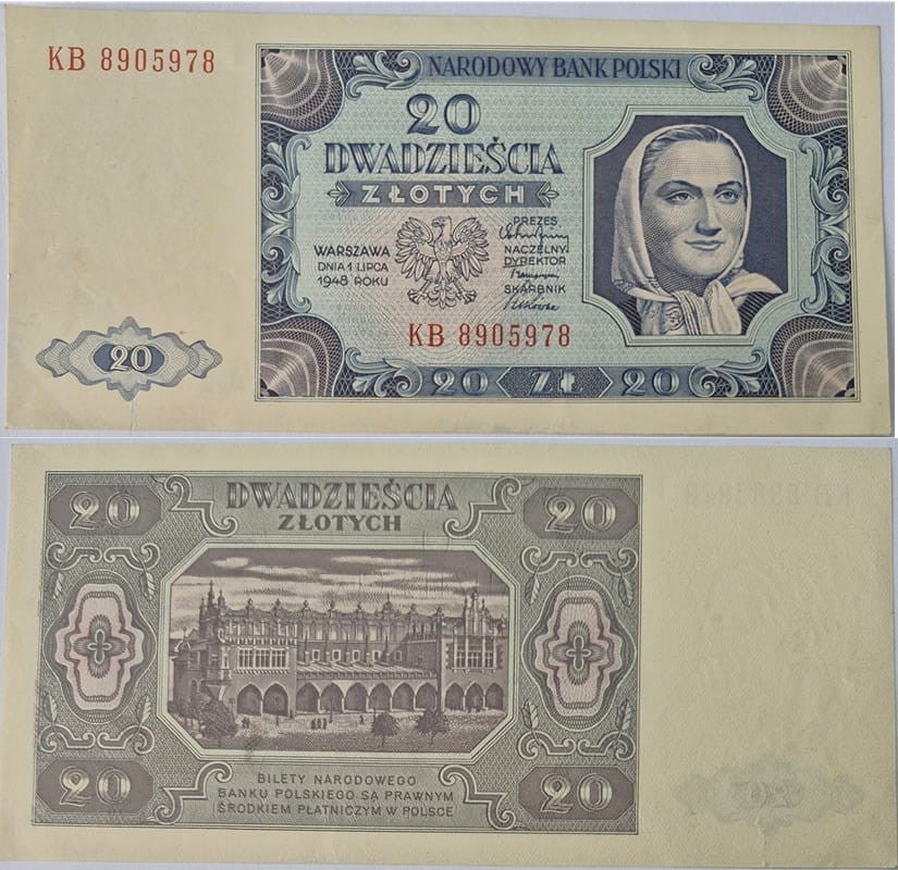 Banknot obiegowy PRL emitent Narodowy Bank Polski, Polska Rzeczpospolita Ludowa, producent PWPW w Warszawie, nominał 20 złotych materiał papier, wymiary banknotu 160 mm x 76 mm, rok emisji 1948, stan zachowania 2/+2, real foto