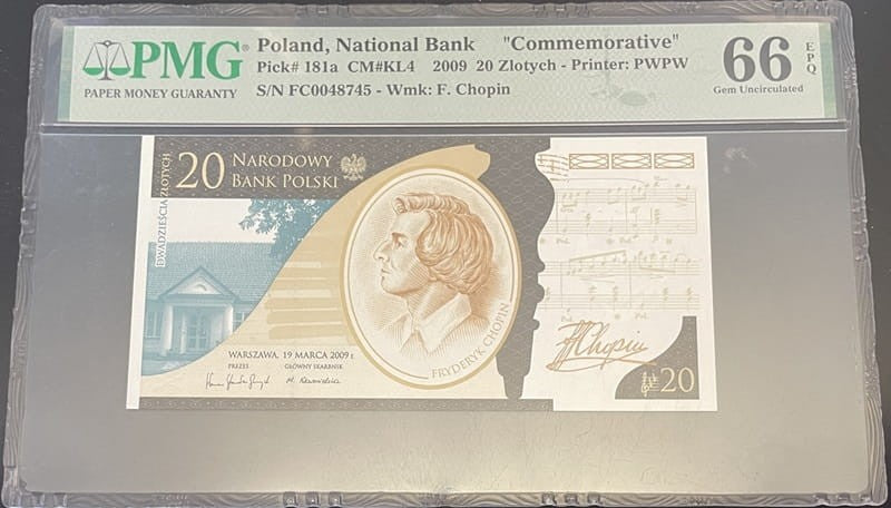 Banknot 20 zł Fryderyk Chopin 2009 PMG 66 EPQ