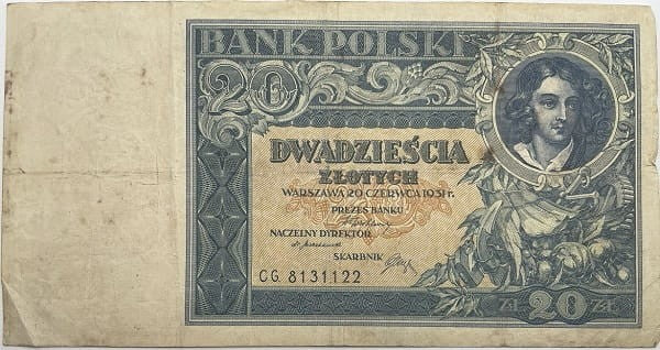 20 zł 1931 r. - banknot obiegowy 20 złotych 1931 r. okresu międzywojennego, materiał papier, stan zachowania 3, real foto