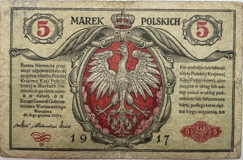 5 marek polskich 1917 r. "generał" - banknot obiegowy w Generalnym Gubernatorstwie Warszawskim, emitowane przez Polską Krajową Kasę Pożyczkową, materiał papier, stan zachowania ok. -4, real foto