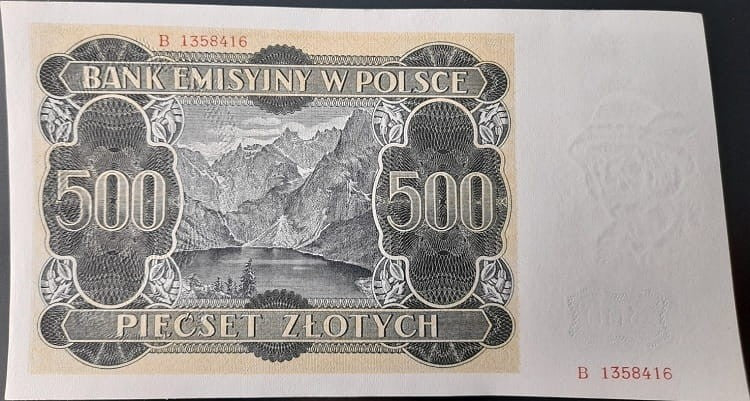 Rewers: Na rewersie banknotu po prawej stronie na dole na niezadrukowanej części seria i jej numer. Seria powtórzona u góry banknotu przy jego marginesie. Na zadrukowanym polu po prawej i lewej stronie nominał banknotu 500, oraz u dołu słownie napis: Pięćset złotych. Na grafice banknotu góry