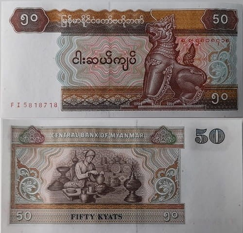 Banknot obiegowy 50 Kyat birmańskich z serii banknotów z umieszczonym lewem (Chinthe). Seria ta obejmuje banknoty od 1 do 1000 (1, 5, 10, 20, 50, 100, 200, 500 oraz 1000) kyat birmańskich. Pierwszy znany banknot w tym stylu graficznym został wemitowany 1994 roku.