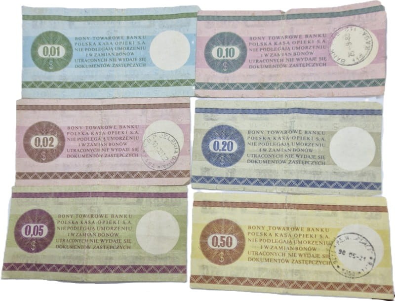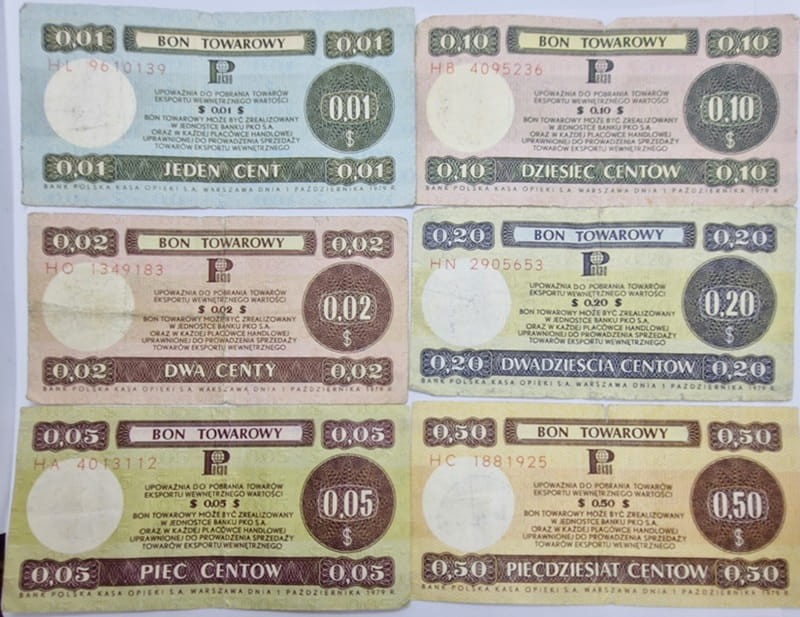 Bon towarowy Pewex emisja 1979 - zestaw obiegowych bonów od 1 centa do 50 centów. Emitent Bank Polski Kasa Opieki SA w Warszawie. Stan zachowania obiegowy - real foto