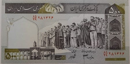 W prawym górnym rogu oraz w lewym dolnym nominał banknotu 500. U góry w dwóch liniach dużymi literami napisy: Islamic Republic Of Iran / Bank Markazi Iran