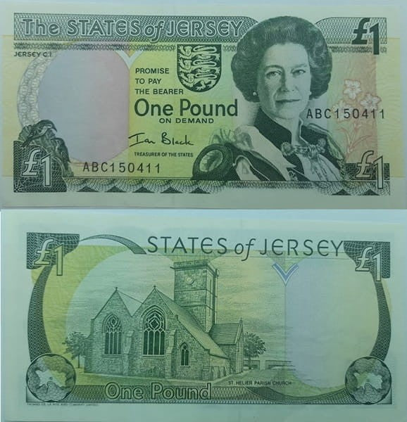 U góry banknotu po prawej i lewej stronie jego nominał 1 funt. Pomiędzy napis: States of Jersey. U dołu banknotu po prawej i lewej stronie kontury wyspy Jersey. Na grafice kościół w St. Helier - Parish church. Pod kościołem słownie: One Pound
