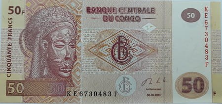 Banknot 50 franków Kongo z kategorii obiegowe banknoty świata kontynent Afryka, rok emisji 2013 r, materiał papier, stan zachowania 1