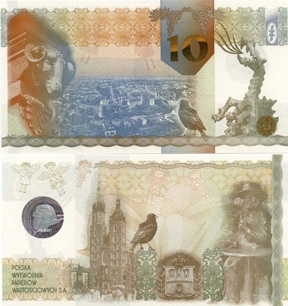 Na rewersie panorama Krakowa. Z lewej strony fasada z głową barana. Po prawej stronie fragment rzeźby smoka wawelskiego. Nad nim logo PWPW.