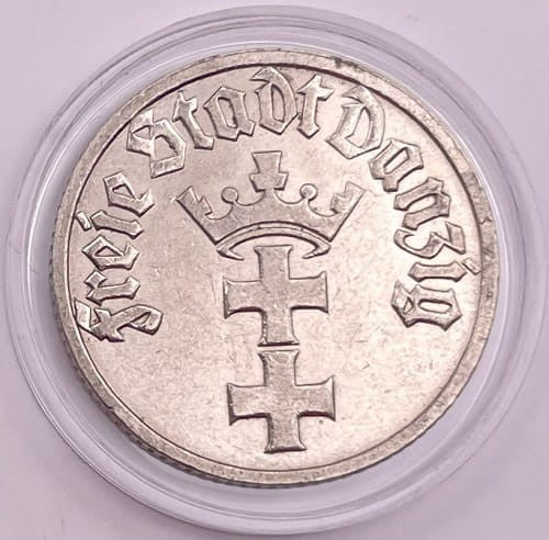 1/2 guldena 1932 r. - moneta obiegowa Wolnego Miasta Gdańsk wprowadzona do obiegu 1932 roku, stempel zwykły, metal nikiel, stan zachowania +2 (zachowana obustronna mennicza świeżość), real foto