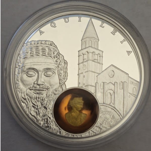 Na awersie u dołu monety bursztyn z zatopioną płaskorzeźbą - popiersie kobiety. Na grafice starożytna zabudowa w Akwilei. U góry przy rancie monety dużymi literami napis: Aquileia