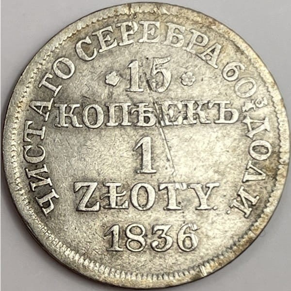 15 kopiejek / 1 złoty MW 1836 r. - srebrna monet z Królestwa Polskiego pod zaborem rosyjskim, stempel zwykły, stan zachowania 3 wersja bez kropki po cyfrach nominału.