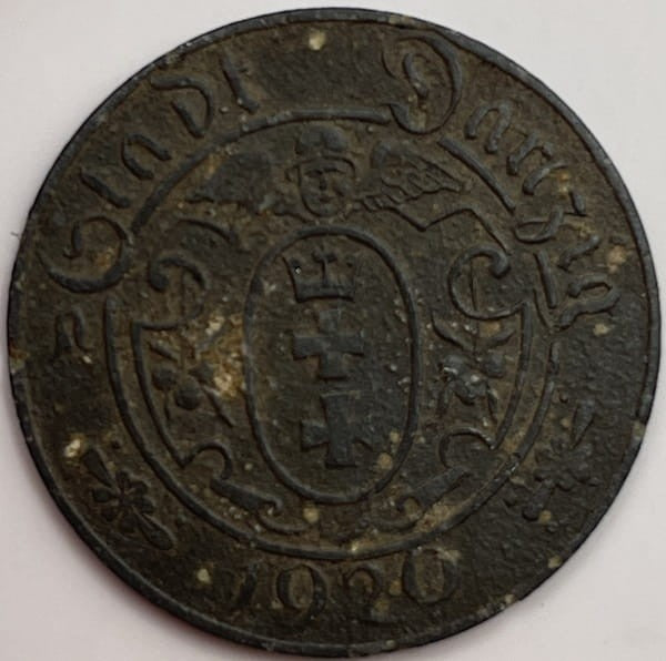 10 fenigów 1920 r. - moneta obiegowa Wolnego Miasta Gdańsk, stempel zwykły, metal cynk, stan zachowania 3/-3, real foto