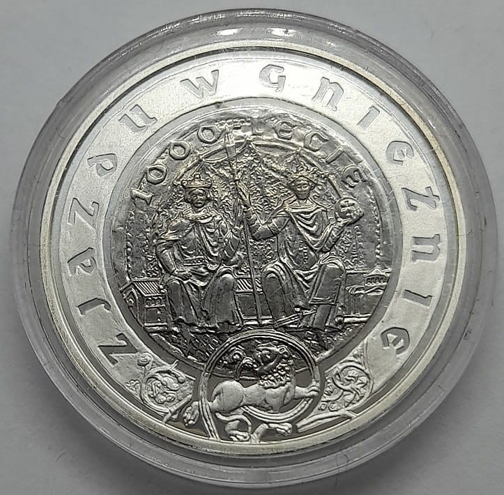 10 złotych 1000-lecie zjazdu w Gnieźnie 2000 r. - srebrna moneta kolekcjonerska NBP, producent Mennica Polska S.A., temat indywidualny, stempel lustrzany oraz częściowa oksyda, stan zachowania L/L, real foto