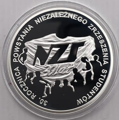 30. rocznica powstania Niezależnego Zrzeszenia Studentów 2011 r. - srebrna moneta kolekcjonerska 10 złotych NBP, temat indywidualny, stempel lustrzany, moneta w kapslu ochronnym, stan zachowana menniczy, real foto