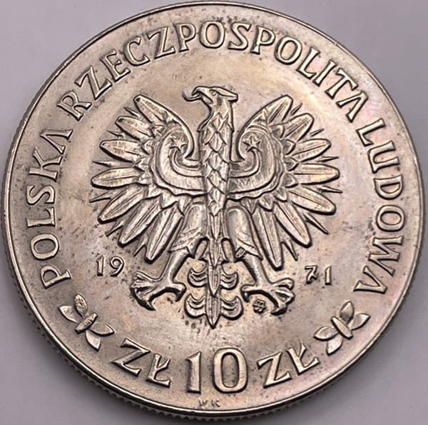 Na awersie w jej centralnym punkcie orzeł bez korony. Przy krawędzi monety w otoku napis dużymi literami: Polska Rzeczpospolita Ludowa oraz nominał monety w zapisie zł 10 zł. Na końcu jak i na początku zapisu nominału motylki. Po obu stronach orła przedzielona data emisji 19-71. Przy lewej łapie orła znak mennicy: m/w