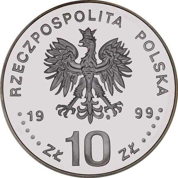 Awers: Na awersie monety orzeł w koronie ustanowiony dla godła Rzeczypospolitej Polskiej, po bokach orła oznaczenie roku emisji: 1999, pod orłem napis: ZŁ 10 ZŁ, w otoku napis dużymi literami: Rzeczpospolita Polska poprzedzony oraz zakończony pięcioma perełkami. Pod lewą łapą orła znak mennicy: M/W.