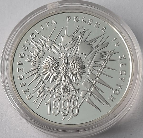 Na awersie w jej centralnym położeniu orzeł w koronie ustanowiony dla godła Rzeczypospolitej Polskiej na tle stylizowanych promieni. Pod orłem rok emisji: 1998. W otoku monety przy rancie napis dużymi literami: Rzeczpospolita Polska, oraz nominał monety 10 ZŁOTYCH. Pod lewą łapą orła znak mennicy: m/w