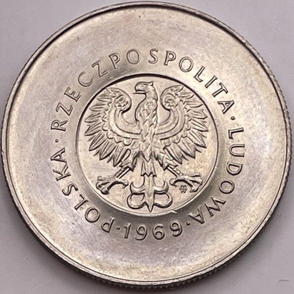 Na awersie w jej centralnym miejscu orzeł bez korony godło ustanowione dla Rzeczpospolitej Polski Ludowej. W otoku wewnętrznym monety na wydzielonej powierzchni napis: POLSKA RZECZPOSPOLITA LUDOWA oraz rok emisji monety 1969 rozpoczynając się i kończący od kropki. Pod lewą łapą orła znak mennicy m/w. Orzeł wpisany jest w okrąg o średnicy połowy średnicy monety