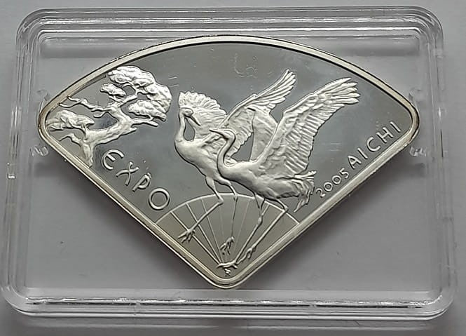 Rewers: Na rewersie monety w jej centrum para żurawi. Z lewej strony monety wizerunek sosny. U dołu monety napisy EXPO oraz 2005 AICHI.