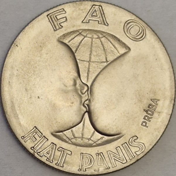 Na rewersie głowa niemowlęcia karmionego piersią. W tle siatka geograficzna Ziemi. U góry monety przy jej rancie napis dużymi literami FAO. U dołu monety napis dużymi literami FIAT PANIS. Po prawej stronie monety wypukłą czcionką dużymi literami napis: Próba