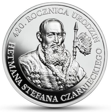 Na rewersie w jej centrum stylizowany wizerunek Hetmana Stefana Czarnieckiego, a w jego tle znak hetmański. W otoku monety napis: 420. ROCZNICA URODZIN HETMANA STEFANA CZARNIECKIEGO.