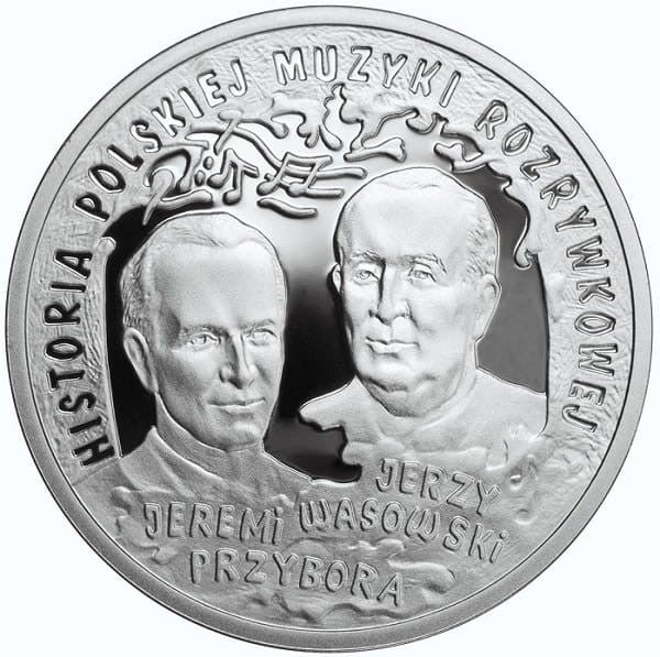 Rewers: Na rewersie monety widnieją stylizowane wizerunki Jeremiego Przybory i Jerzego Wasowskiego w otoku monety napis: HISTORIA POLSKIEJ MUZYKI ROZRYWKOWEJ. U dołu monety po lewej stronie w dwóch rzędach napis: JEREMI PRZYBORA, po prawej stronie monety napis: JERZY WASOWSKI