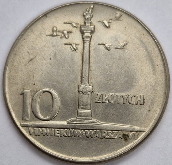 10 zł Kolumna Zygmunta 1965 r. - moneta okolicznościowa PRL miedzionikiel 10 złotych NBP, producent Mennica Polska S.A., temat indywidualny, stempel zwykły, moneta wysyłana zabezpieczona w woreczek strunowy, stan zachowania 2, real foto