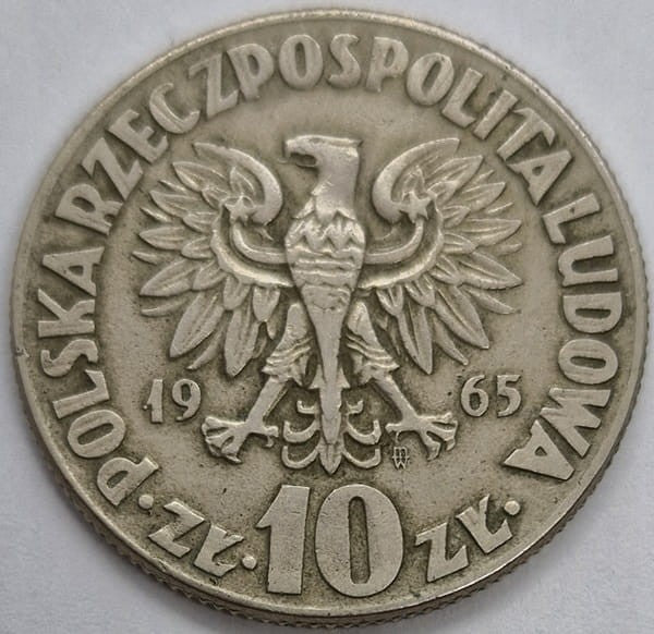 Na awersie w jej centralnym punkcie orzeł bez korony. Przy krawędzi monety w otoku napis dużymi literami: Polska Rzeczpospolita Ludowa oraz oddzielony od napisu na początku i na końcu koralikiem nominał monety 10 zł. Przy łapach orła rozdzielony na pół rok emisji 1965. Przy lewej łapie orła znak mennicy: m/w