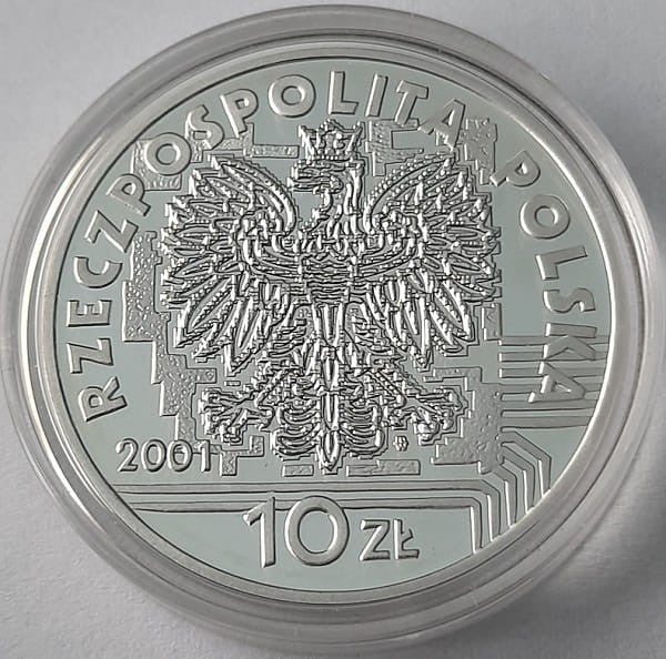 Rok 2001 r. - srebrna moneta kolekcjonerska 10 złotych NBP, producenta Mennica Polska S.A., temat indywidualny, stempel lustrzany, w kapslu ochronnym, stan zachowania L/L