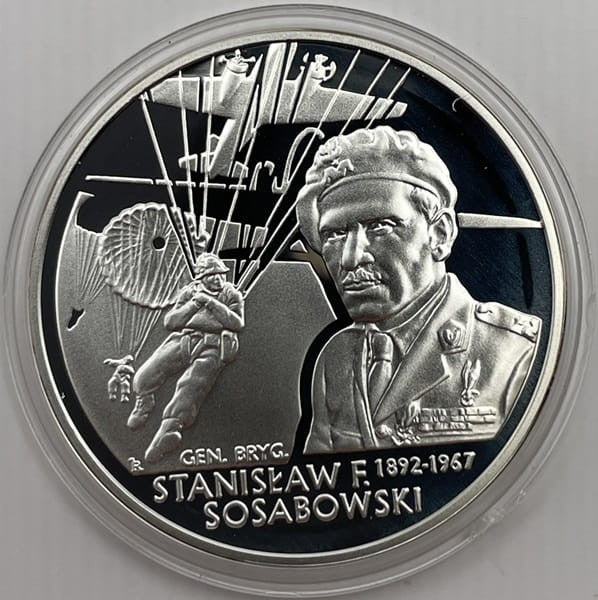 10 złotych Stanisław Sosabowski 2004 r. - srebrna moneta kolekcjonerska 10 złotych NBP - Narodowy Bank Polski, producent Mennica Polska S.A., temat indywidualny, stempel lustrzany, moneta w kapslu ochronnym, stan zachowania L/L patynka