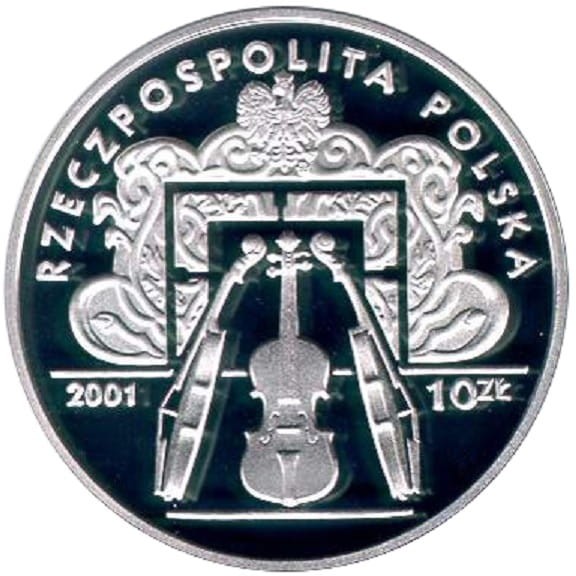 Na awersie u góry orzeł w koronie ustanowiony dla godła Rzeczypospolitej Polskiej. U góry także półkolem napisy dużymi literami: Rzeczpospolita Polska. U dołu monety trzy stylizowane skrzypce. Po lewej ich stronie rok emisji monety 2001, po prawej stronie monety jej nominał w zapisie 10 ZŁ. Pod lewą łapą orła znak mennicy: m/w