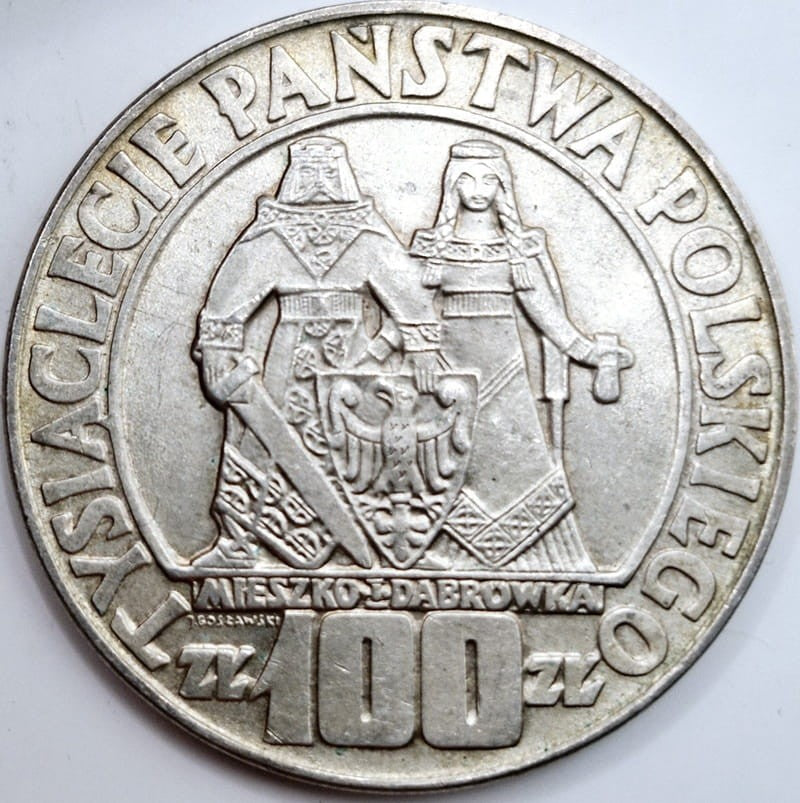 Moneta rocznicowa, wydana z okazji obchodów 1000-lecia państwa polskiego. Znane są 3 wersje tego tematu o nominale 100 złotych. Pierwsza z wersji to stylizowane wizerunki postaci Mieszka i Dąbrówki, druga wersja to popiersia, trzecia zaś to głowy Mieszka i Dąbrówki z prawego profilu. Pierwsza i druga moneta mają taki sam wizerunek awersu, zaś moneta z głowami na awersie widnieje duży orzeł bez korony zajmujący większość pola awersu. Przy rancie monety napisy dużymi literami u góry Rzeczpospolita u dołu Ludowa Polska. Znak mennicy w tej wersji jest nad łapą i szponami orła. Między szponami zaś, po lewej stronie jest pierwsza część daty z cyframi 19, po prawej stronie druga z cyframi 66