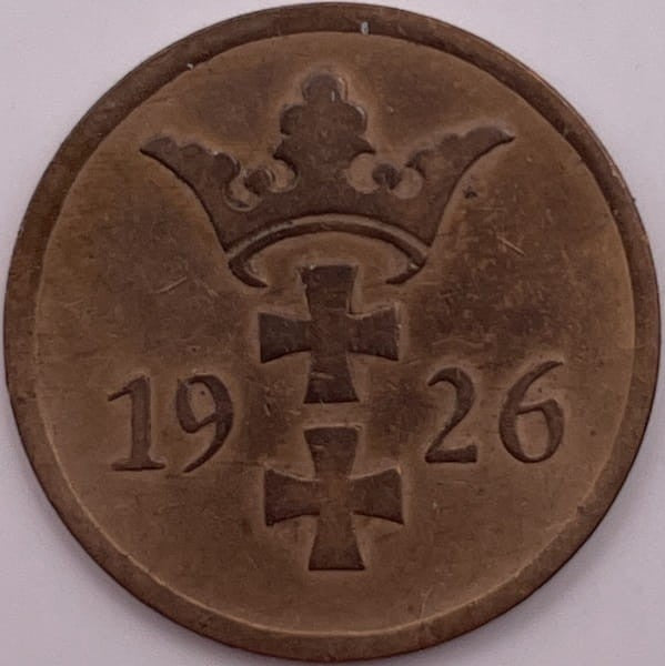 2 fenigi 1926 r. - moneta obiegowa Wolnego Miasta Gdańsk wprowadzona do obiegu 1926 roku, stempel zwykły, metal brąz, stan zachowania -2, real foto