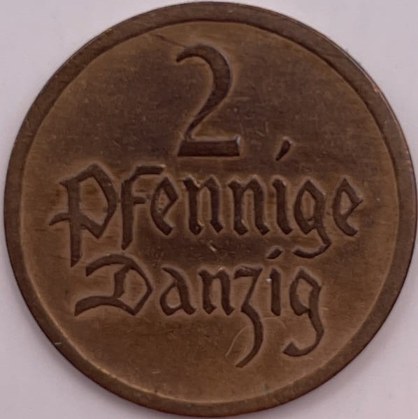 Na rewersie monety u góry jej nominał 2 oraz poniżej słownie napis z dużej litery: Pfennige. Poniżej również z dużej litery napis: Danzig