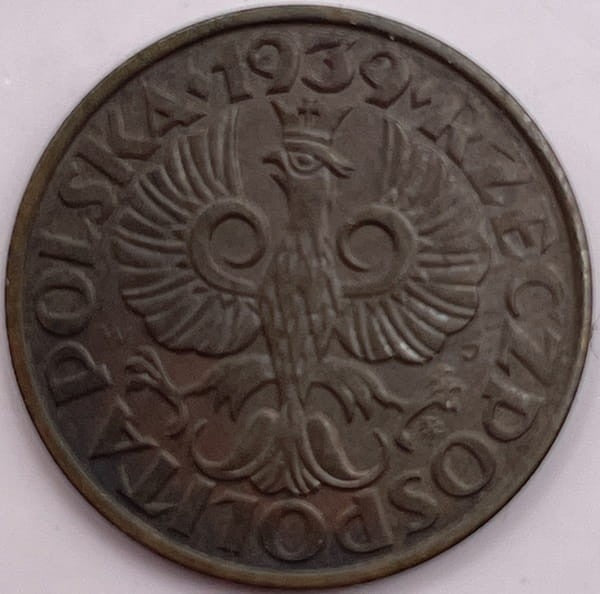 2 grosze 1939 r. - moneta obiegowa z okresu II Rzeczpospolitej Polskiej, metal brąz, emitent Bank Polski, producent Mennica Państwowa, stempel zwykły, stan zachowania +2, real foto