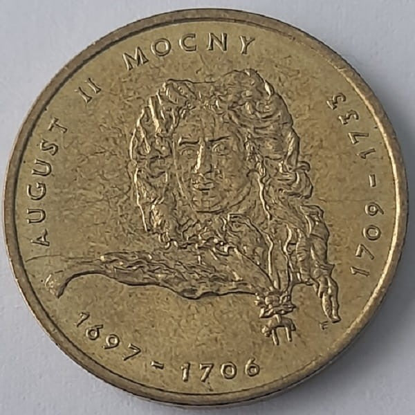 2 złote August II Mocny 2002 r. - moneta okolicznościowa 2 złote Nordic Gold NG NBP - Narodowy Bank Polski, producenta Mennica Polska S.A., z serii Poczet Królów i Książąt Polskich, stempel zwykły, moneta w kapslu ochronnym, stan zachowania 1/-1