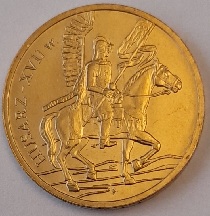 Rewers: Na rewersie monety wizerunek husarza z XVII wieku na koniu, w zbroi, ze skrzydłem husarskim i skórą lamparcią na plecach, w ręku trzyma kopię z proporcami. Z lewej strony monety półkolem napis: HUSARZ – XVII w.