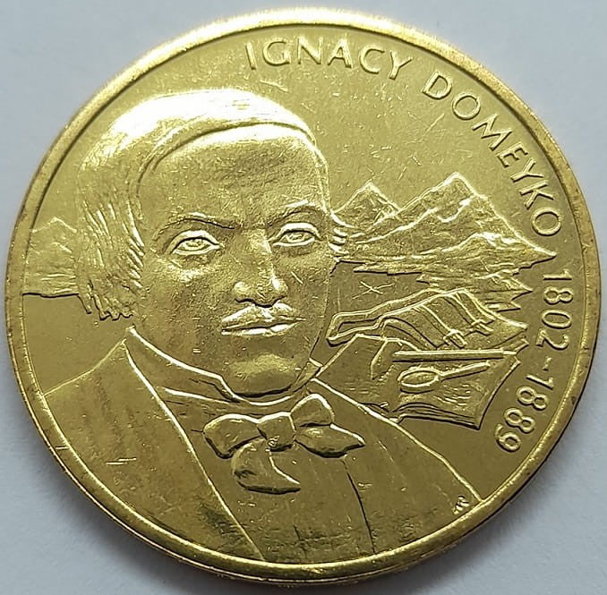 Na rewersie stylizowane popiersie Ignacego Domeyki z portretu A. Kurowskiego z 1833 r. W tle Ignacego Domeyki stylizowany wizerunek gór, a także przybory pracy jak torba, książka, młotek oraz lupa. Od góry monety, ku prawemu dołowi napis półkolem dużymi literami: Ignacy Domeyko 1802-1889