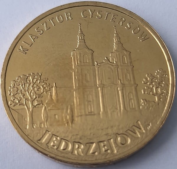 Na rewersie z lewej strony stylizowany wizerunek fasady kościoła Cystersów oraz fragment kościoła Cystersów. Po obu stronach kościoła stylizowany wizerunek drzew. U góry monety przy jej rancie zaokrąglony napis: KLASZTOR CYSTERSÓW, u dołu monety przy jej rancie zaokrąglony napis dużymi literami: Jędrzejów