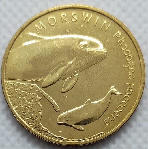 Na rewersie monety wizerunki dwóch morświnów. U góry i z prawej strony półkolem napis: MORŚWIN Phocoena phocoena. U dołu fragment stylizowanej mapy Polski.