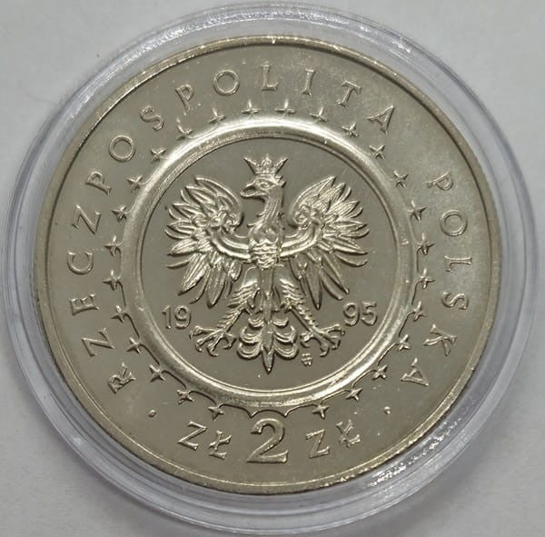 Na awersie widnieje orzeł w koronie godło ustanowione dla Rzeczypospolitej Polski wpisany w koło z ozdobnymi lilijkami. Po bokach orła rozdzielona data emisji monety 19 - 95. W otoku napis dużymi literami Rzeczpospolita Polska oddzielony po obu stronach perełką od nominału monety w zapisie ZŁ 2 ZŁ. Pod lewą łapą orła znak mennicy: m/w