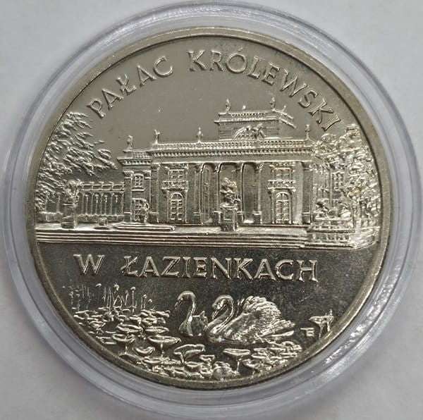 Na rewersie frontowa część Pałacu Królewskiego w Łazienkach, poniżej dwa łabędzie płynące wśród roślinności. W górnej części monety półkolem napis dużymi literami: Pałac Królewski poniżej pałacu napis: w Łazienkach