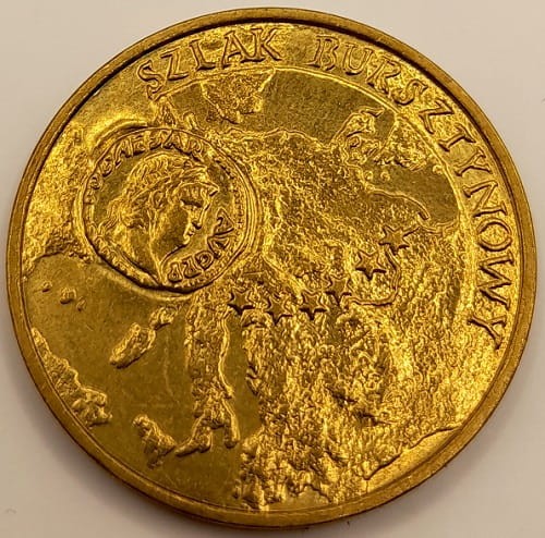 Na rewersie widnieje stylizowana mapa Europy z oznaczonym gwiazdkami szlakiem bursztynowym (czyli szlak handlowy kupców oferujących bursztyn). Z lewej strony denar z wizerunkiem Nerona. U góry półkolem napis dużymi literami: Szlak bursztynowy