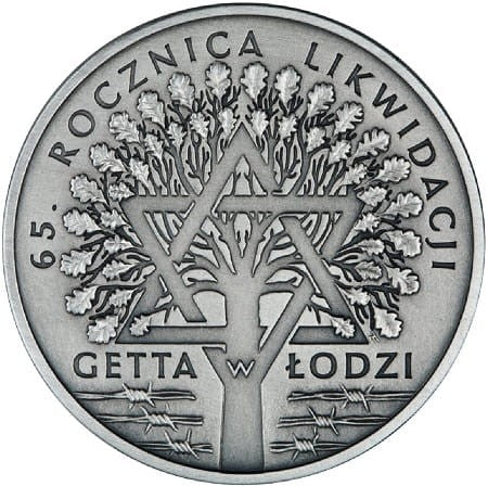 Na rewersie wyrastające z pękającego mury z przerwanym drutem kolczastym stylizowane drzewo z liśćmi dębu i pniem w kształcie gwiazdy Dawida. U dołu monety przez jej szerokość przebiega poziomy napis: Getta w Łodzi, a u góry monety przy jej rancie napis dużymi literami: 65. rocznica likwidacji